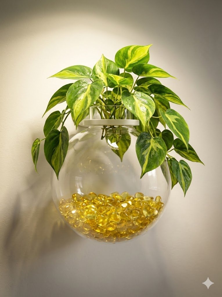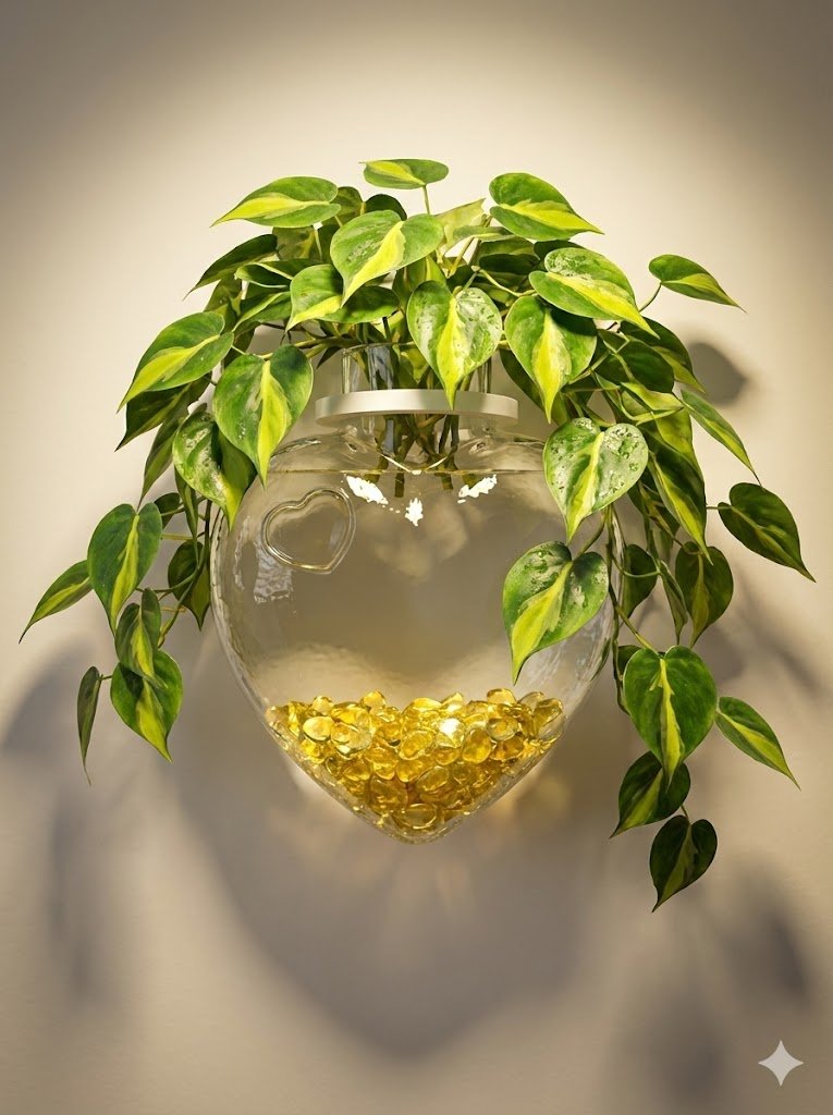 زجاج تعليق للحائط يمكن الاستفاده منه في نباتات الزينه المائية و يمكن استخدامه كحوض للاسماك و يحتوي على شكلين الشكل الاول قلب والشكل الثاني دائري